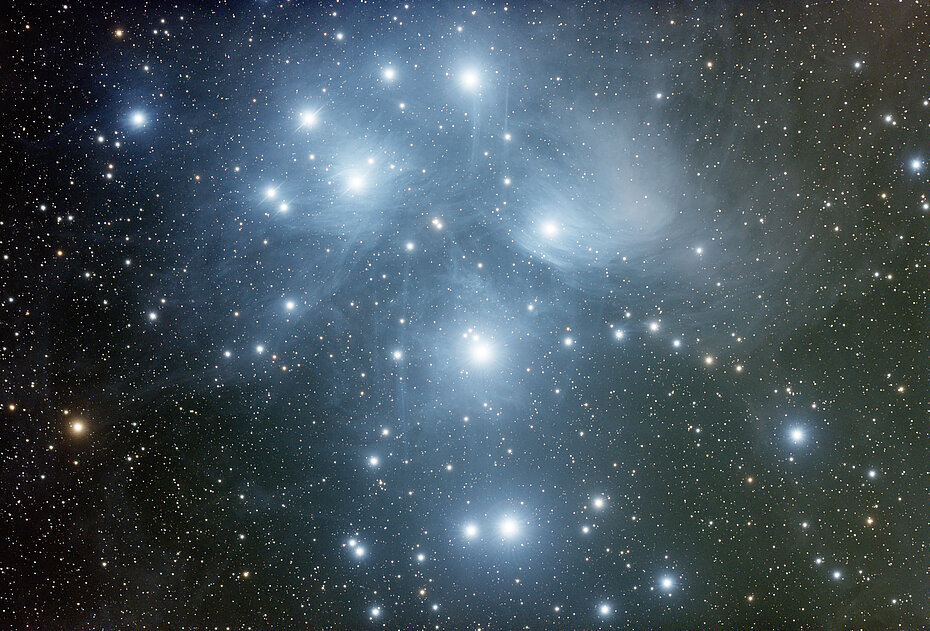 Die Plejaden (M45) sind ein offener Sternhaufen im Sternbild Stier, umgeben von feinen Reflexionsnebeln.